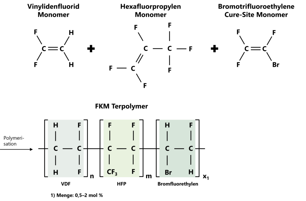 Chemisch handelt es sich bei (Standard-)FKM um fluorierte Copolymere, bei denen Wasserstoffatome in der Polymerstruktur teilweise durch Fluoratome ersetzt sind. Der Aufbau erfolgt aus verschiedenen fluorhaltigen und teilfluorierten Monomeren, typischerweise Vinylidenfluorid (VDF), Hexafluorpropylen (HFP) sowie – bei höherwertigen Qualitäten – Tetrafluorethylen (TFE).