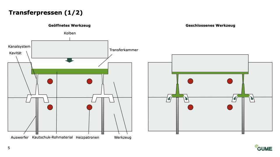 Das Transfer-Formpressen, auch bekannt unter den als Transferpressen oder unter der englischen Bezeichnung Transfer Molding, ist ein etabliertes Verfahren zur Herstellung von präzisen Formteilen aus Elastomeren, insbesondere in Verbindung mit Metalleinlegeteilen oder anderen Trägermaterialien. Dabei wird das Kautschuk-Rohmaterial in eine separate Kammer des Werkzeugs, der sogenannten Transferkammer, eingelegt und mit schließen des Werkzeugs von dort über Kanäle in die Kavitäten gepresst. In den Kavitäten erfolgt durch gezielte Temperaturführung die Vulkanisation.